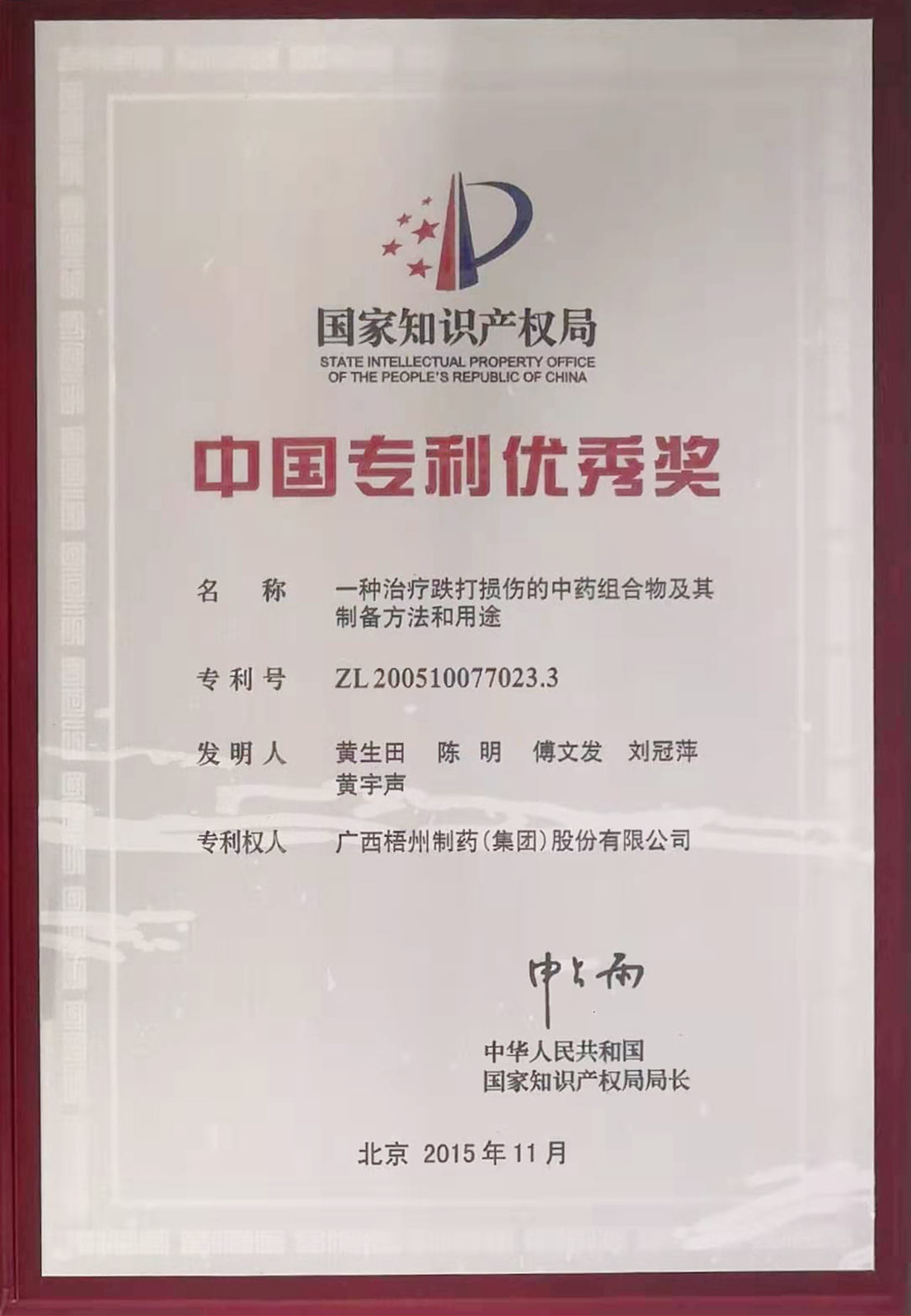 藥組合物及其制備方法和用途》項(xiàng)目榮獲中國專利優(yōu)秀獎(jiǎng)。