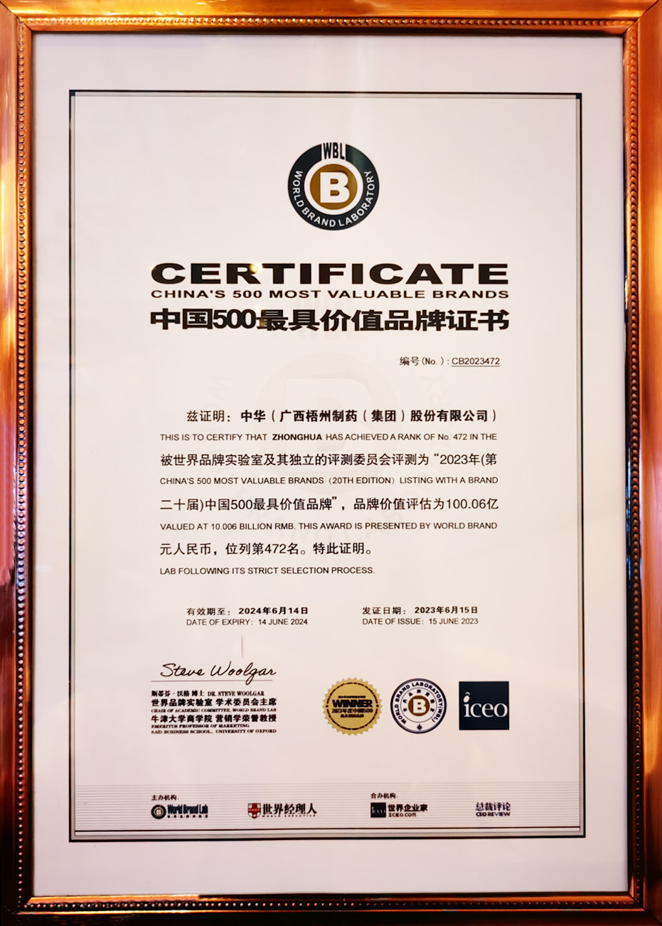 早在2021年,中國品牌建設(shè)促進(jìn)會已將“中華”品牌列入“中華老字號”組50強(qiáng),品牌價值為70.52億元。2023年,“中華”品牌經(jīng)世界品牌實驗室及其獨立的評測委員會評測認(rèn)證,成功入選2023年(第二十屆)中國500最具價值品牌,獲此殊榮,是世界品牌實驗室對梧州制藥持續(xù)推進(jìn)“中華”品牌建設(shè),實現(xiàn)品牌價值不斷提升的充分肯定。同時,彰顯了公司穩(wěn)健的發(fā)展態(tài)勢和強(qiáng)勁的品牌實力。
