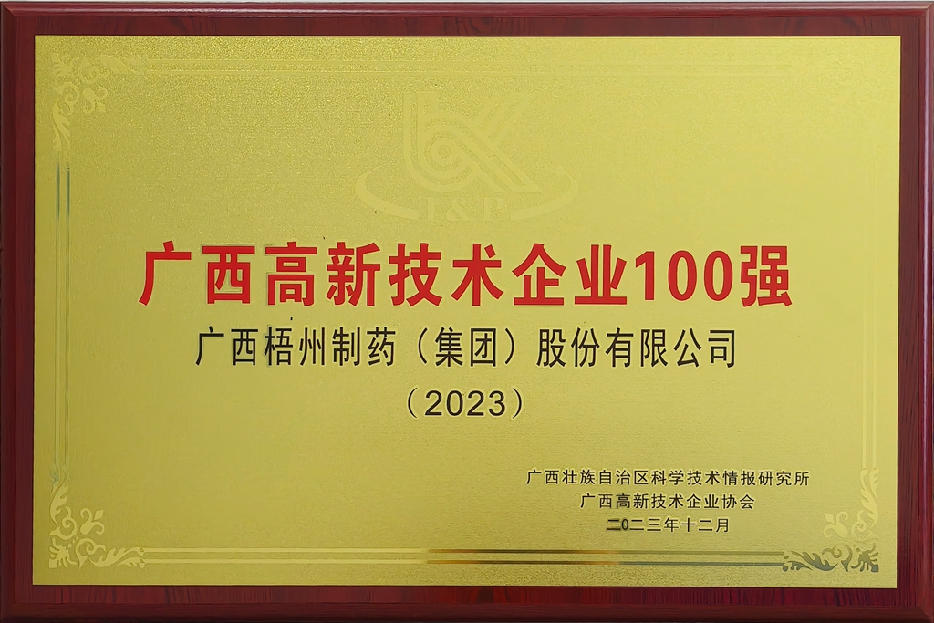 廣西梧州制藥(集團(tuán))股份有限公司獲評2023年廣西高新技術(shù)企業(yè)100強(qiáng)
