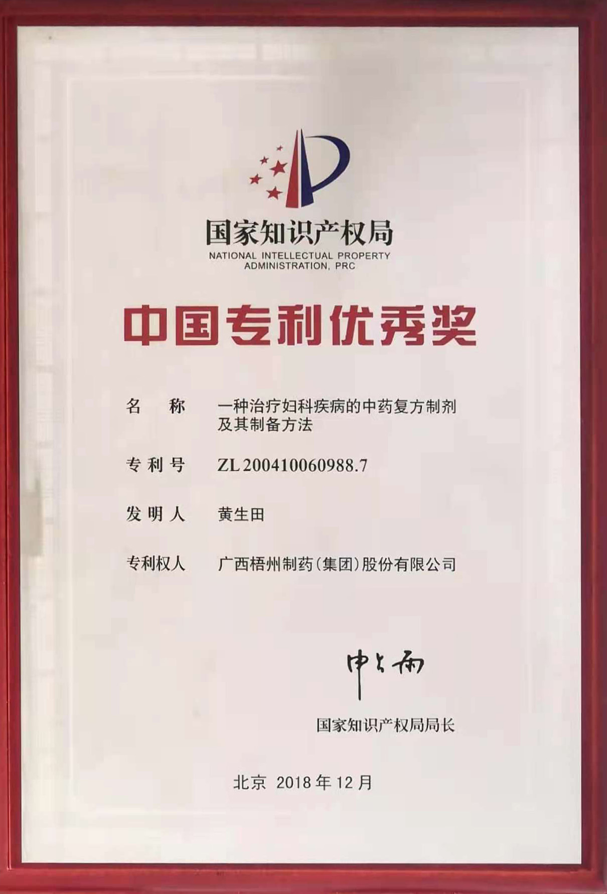 黃生田參與的《一種治療婦科疾病的中藥復(fù)方制劑及其制備方法》項(xiàng)目榮獲中國專利優(yōu)秀獎。